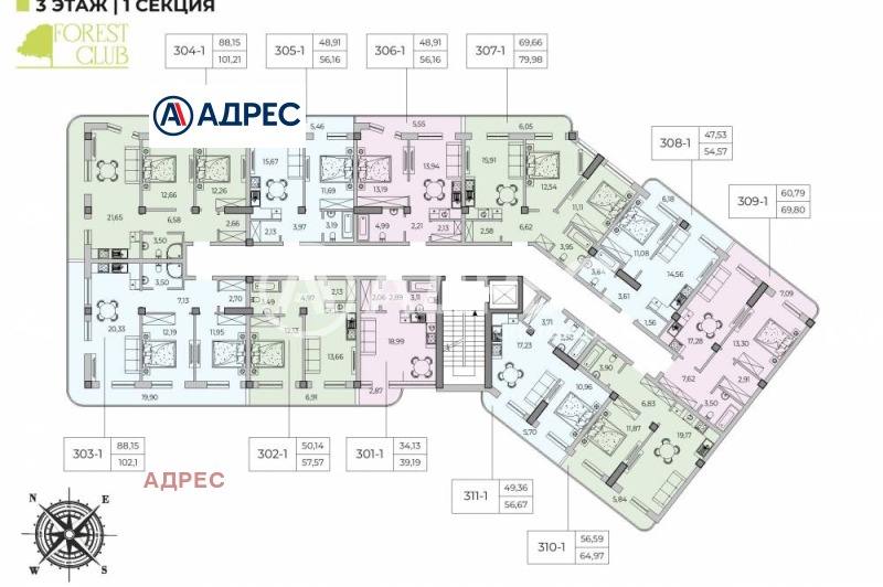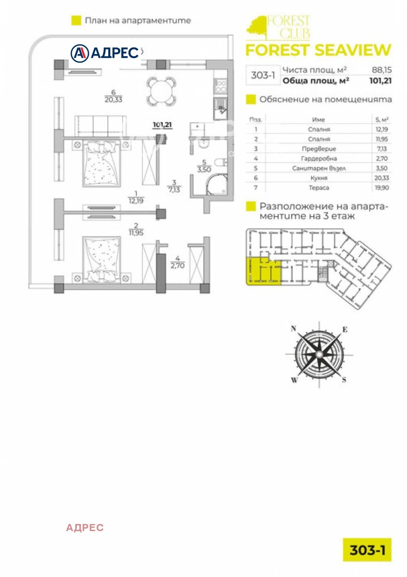 Тристаен тухлен апартамент в сграда в строеж. Жилището се състои от просторна дневна с кухненски бокс, две спални, баня с тоалет, килер, входно антре и тераса. Forest SeaView е жилищен комплекс от 5-етажни сгради, разположен на 15 минути от най-добрите плажове на Варна. Апартаментите в комплекса, ще бъдат с морска и горска панорама.