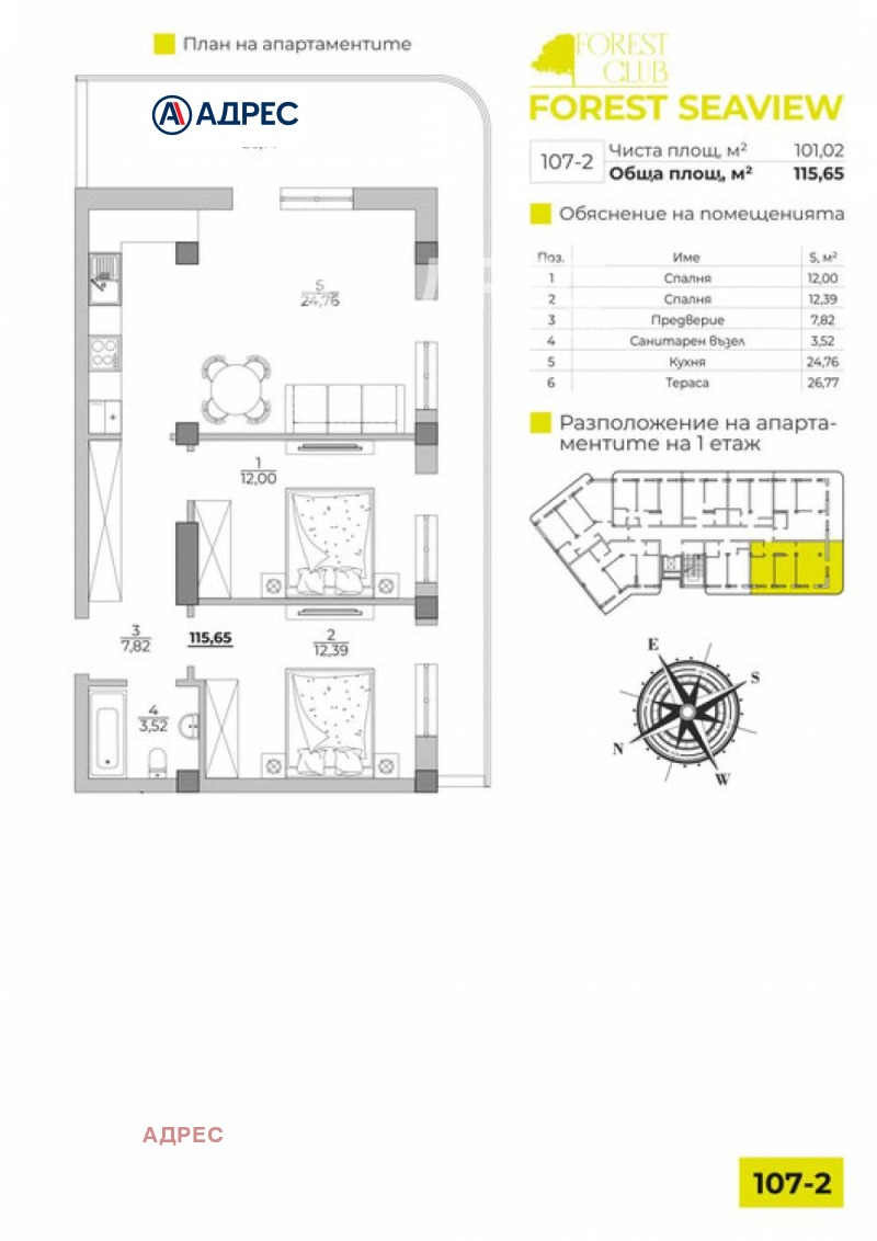 Тристаен тухлен апартамент в сграда в строеж. Жилището се състои от просторна дневна с кухненски бокс, две спални, баня с тоалет, килер, входно антре и тераса. Forest SeaView е жилищен комплекс от 5-етажни сгради, разположен на 15 минути от най-добрите плажове на Варна. Апартаментите в комплекса, ще бъдат с морска и горска панорама.