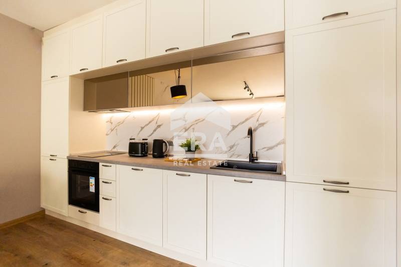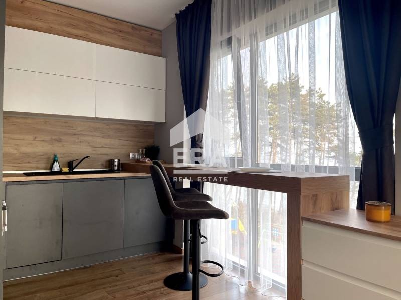 Обявеният за продажба имот е разположен на трети етаж в четириетажна жилищна сграда с асансьор, въведена в експлоатация през 2023 г. Продава се напълно обзаведено и оборудвано с всички необходими мебели и уреди, осигуряващи спокойствие при престоя. Санитарното помещение е напълно оборудвано. Кухненският бокс е оборудван с всички необходими уреди - съдомиялна машина, готварска печка, вградени котлони, абсорбатор. Мебелите са висок клас, голяма част от тях, изготвени по поръчка. Подовите настилки в коридора и общото помещение са ламинат, стените са боядисани с латекс, монтирани са интериорни MDF врати, поставени са климатици и осветителни тела. Изложението е изцяло южно.