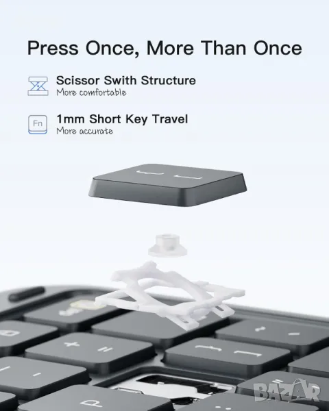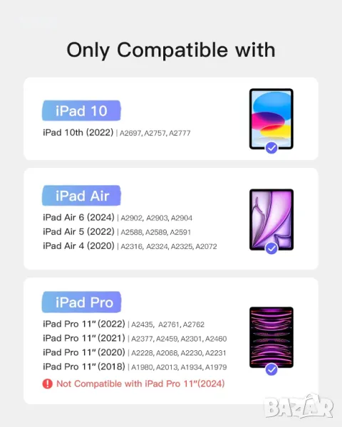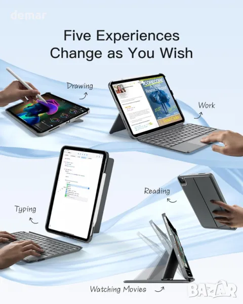 Тази ултратънка клавиатура, с дебелина само 7,6 мм и тегло 454 грама, я прави изключително преносима за лесно носене в ръчна чанта или раница. Той е специално проектиран за различни модели iPad, iPad 10 (10,9 инча), iPad Air 4/5 (10,9 инча) и iPad Pro 11 инча 1/2/3/4. Съвместим с iPad Pro 11 4-то поколение 2022 (A2435/A2759/A2761/A2762), iPad Air 5-то поколение 2022 (A2591/A2589/A2588), iPad Air 4-то поколение 2020 (A2325/A2324/A2316/A2072), iPad Pro 11 3-то Gen 2021 (A2301/A2377/A2459/A2460), iPad Pro 11 2-ро поколение 2020 (A2228/A2068/A2230/A2231), iPad Pro 11 1-во поколение 2018 (A1980/A2013/A1934/A1979). Магнитният разглобяем дизайн позволява бързо отделяне от защитния калъф, предлагайки гъвкави ъгли на видимост за работа, забавление или творчески задачи. Клавиатурата осигурява гладко изживяване при писане с 1 mm ход на клавишите и структура на превключвател с ножица. Неговият мултитъч тъчпад с пълна площ поддържа прецизни контроли и жестове с iPad OS.