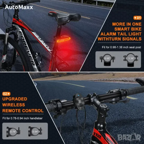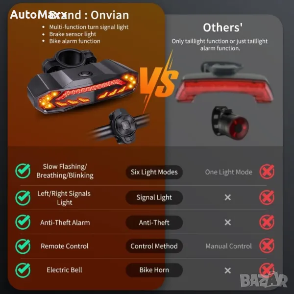 ONVIAN Интелигентна задна светлина за велосипед с мигачи, клаксон за велосипед, аларма за велосипед с дистанционно, акумулаторна задна светлина за велосипед, водоустойчиво автоматично включване/изключване Светлини за велосипед