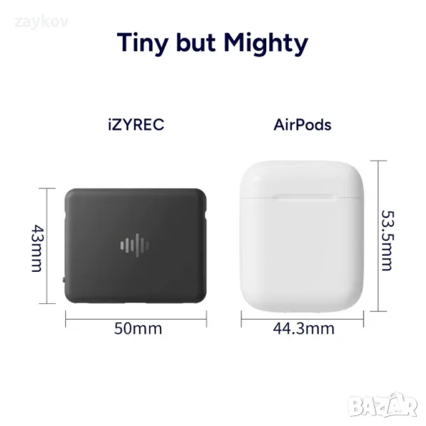 Диктофонът iZYREC MINI работи още по-добре със своето приложение. Лесно намирайте и възпроизвеждайте вашите аудио файлове, организирайте ги и споделяйте с други – всичко това чрез удобното за потребителя приложение iZYREC. Пасва дискретно навсякъде: Наполовина по-малък от кредитна карта и дебел колкото монета, диктофонът iZYREC MINI може да отиде навсякъде и да записва дискретно. Предлага се с щипка и велкро за запис без ръце. Лесно записване: Просто плъзнете, за да започнете да записвате – мини диктофонът е винаги готов. Страхотно качество на звука: iZYREC гласовият рекордер разполага с AI шумопотискане и двойни микрофони Knowles SiSonic за супер ясен звук до 1536 Kbps. Запис за 30 часа: Оборудван с батерия от 450 mAh, iZYREC MINI може да записва до 30 часа без прекъсване и остава готов до 75 дни. Голям капацитет: Мини рекордерът използва eMMC съхранение. С 32GB съхранява до 240 часа, а с 64GB съхранява до 480 часа записи. Защитете вашите файлове: Осигурете сигурността на вашите гласови бележки с файловата защита на iZYREC. Дори ако някой има вашия мини рекордер, той не може да получи достъп до вашите файлове от смартфон.