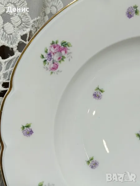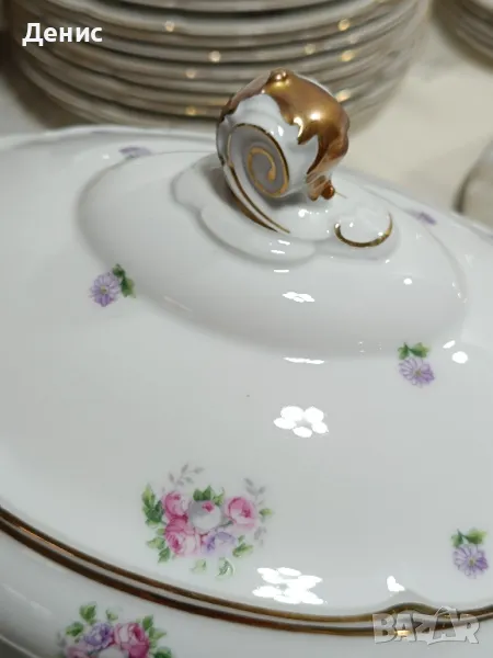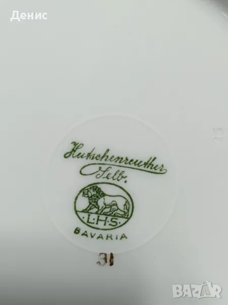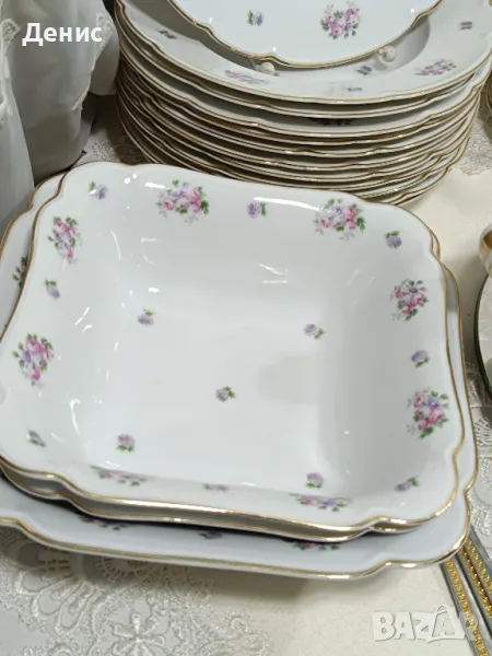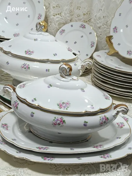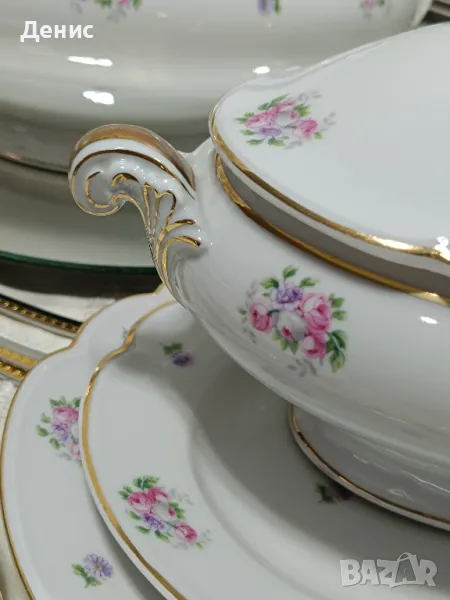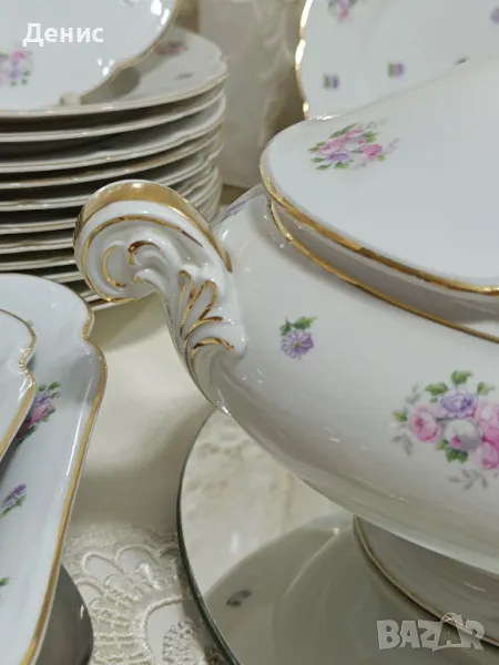 Искам да ви покажа моя избор.🇩🇪Hutschenreuter🇩🇪Немски порцелан от фабрика основана през 1814 год.в Бавария.Представям сервиз за хранене за 12души.Една история и съчетание с въображение,стил,вкус и изтънченост -това е порцеланът на Lorenz Hutschenreuter.Старинен порцелан в бяло и нежни цветя ,маркиран през периода 1925-1939год.Сервиз за 12души-Чиния за основно 26см 12бр.-Чиния за супа 25см. 12бр-Десерна чиния 19см. 6бр.-Супник голям 2.5литра-Съд за топло сервиране 1.5литра-Плато продълговато 40см./26см--Плато 32см./22см. 2 броя-Плато 26/15см-Квадратна купа 25см./22см-Квадратна купа 21см/21см 2бр.Няма пукнато или пукнато.В завидно състояние за годините си със забележка на златния кант на едно от платата,вижда се на една от снимките и същата забележка на две от чиниите.Свеж порцелан в ярки цветове на декора.Собственика ме увери ,че е ползван много рядко и винаги частите са мити на ръка и видно си личи ,че е ползван с любов.Опаковам сигурно за моя сметка.