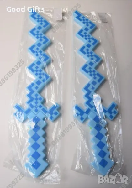 Атрактивен детски меч със светлинни ефекти. Меча е изработен по дизайн като този от играта Майнкрафт. Той ще развълнува и зарадва Вашето дете!Големият меч диамант е може би най-популярният детски меч сред детските играчки. Диамантеният меч на Minecraft се появи благодарение на известната детска игра Minecraft.Изработен в три цвята синьо, зелено и червено. Когато е включен, диамантеният меч свети и симулира звуците на битката. Супер ефектно за малкия войн!Децата обичат да играят с този модел на меча, преструвайки се, че са героите на любимата си компютърна игра.