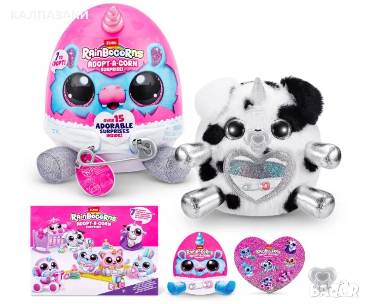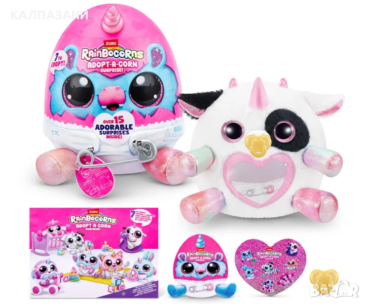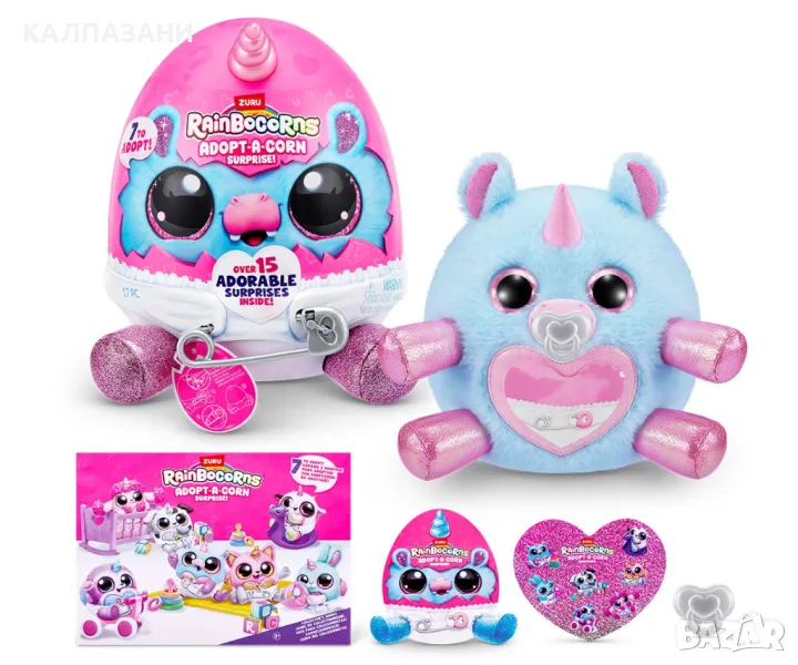 Осиновете чисто нов най-добър приятел с изцяло новите Adopt-A-Corns! Най-сладките малки бебета Rainbocorns пълзят из Rainboville и се нуждаят от вашата любов и грижи! Откопчайте вашия Adopt-A-Corn от пелената му за приключенско забавление и го закопчайте обратно, когато дойде време за почивка. Не забравяйте за залъгалката! Има 7 Adopt-A-Corns за осиновяване. Всяко яйце идва с над 15 очарователни изненади вътре!