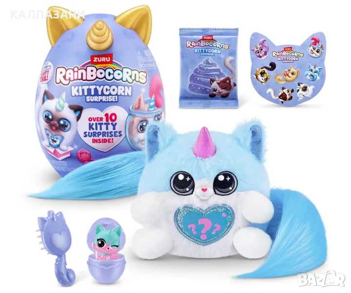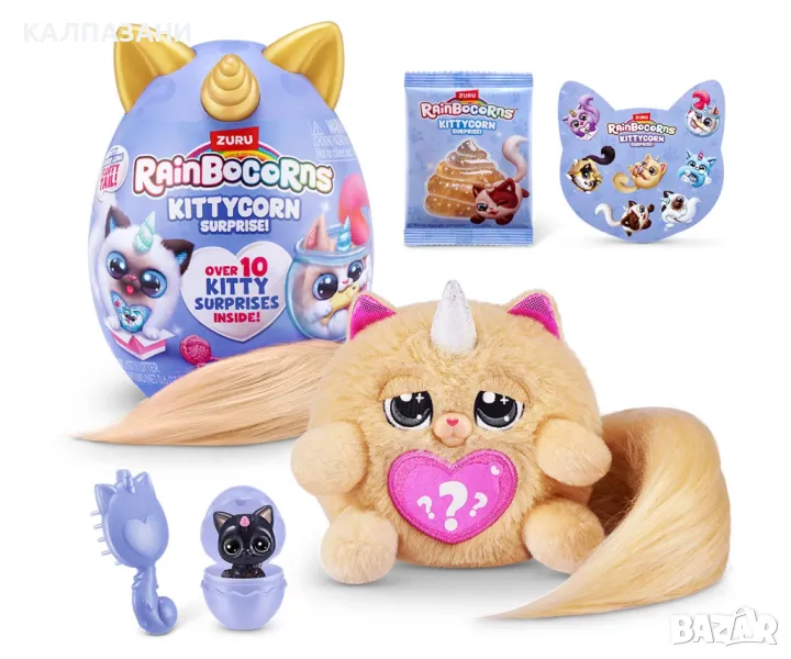 Най-перфектните котенца са се излюпили в Rainboville и са готови да играят в Kittycornia. С всички нови супер меки, супер дълги пухкави опашки, тези котенца ще станат най-добрите ви приятели. Кой Kittycorn ще разопаковате? Може да е редкият Kittycorn Munchkin! Погрижете се за вашия нов мъркащ перфектен приятел с включения гребен. Не забравяйте да отворите своя boo-boocorn и от яйцето му! Очаква ви повече забавление с еластичната смес за котешка тоалетна. Вътре има над 10 котешки изненади!