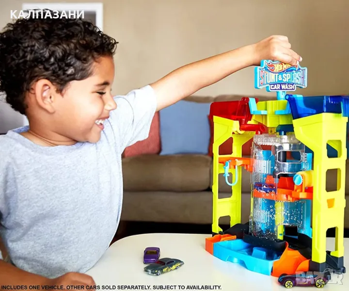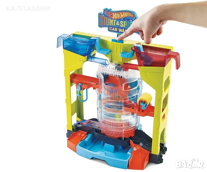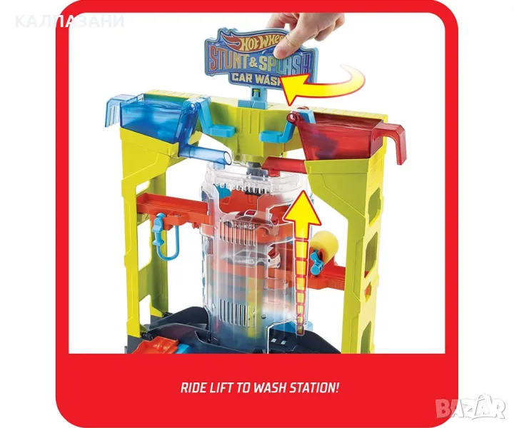 Комплектът Hot Wheels® Stunt Splash Car Wash™ комбинира елементи от истинска автомивка с вълнуващия свят на Hot Wheels®. Асансьорът с ръчно управление превозва автомобилите през сложна конструкция, която води до пръскачка, с която децата пускат вода върху колите. Децата определят дали водата да е топла, или студена, което променя цвета на количките Hot Wheels® Color Shifter™. Hot Wheels® Stunt Splash Car Wash™ се свързва с други комплекти Hot Wheels™ City (продават се отделно) за приключения из целия град. Децата на възраст четири години или повече ще се забавляват истински с този комплект часове наред. Цветовете и декорациите може да се различават.