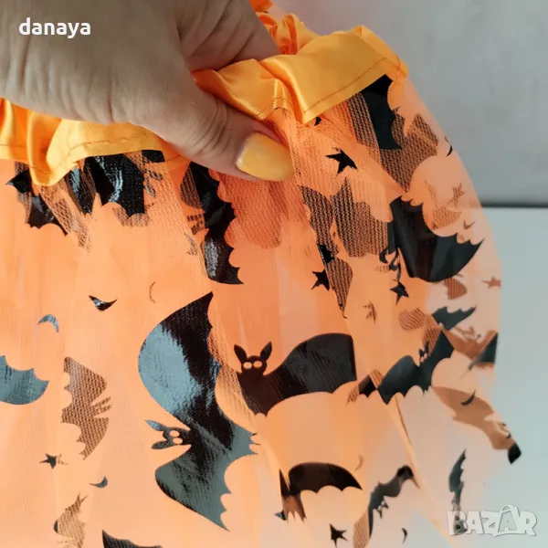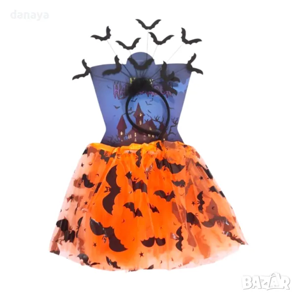 – оранжева тюлена пола, изработена от 3 слоя тюл, ластик в талията и декорация черни прилепи по полата.