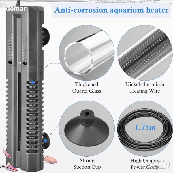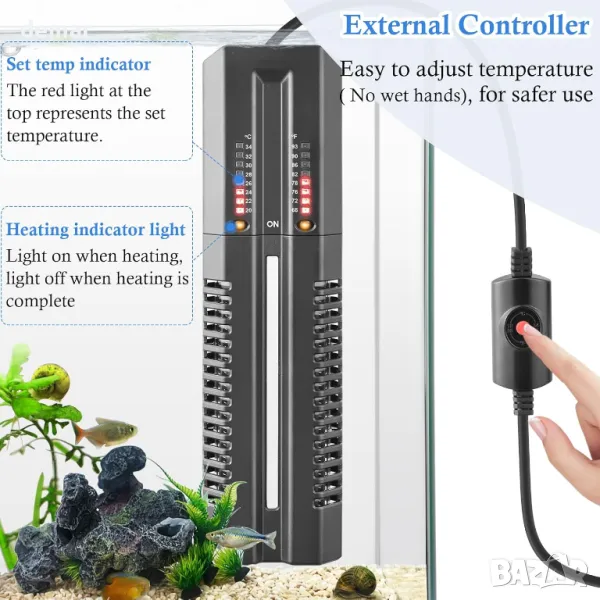 Този нагревател от кварцово стъкло с двойна тръба от 400 W осигурява бързо нагряване за резервоари с морска или сладка вода от 150-200 L. Външният температурен контролер позволява лесни настройки между 68-93 ℉, без да се намокри, включващ функция за памет за прекъсване на захранването. Издръжливият, подвижен капак на нагревателя предпазва както устройството, така и рибите, с устойчивост на корозия и удар. Двойните 2 mm удебелени кварцови тръби осигуряват стабилно, ефективно отопление, докато топлоустойчивият кварцов памук абсорбира ударите. Пакетът включва 1,75 м захранващ кабел, 5 вендузи и термометър за следене на температурата.
