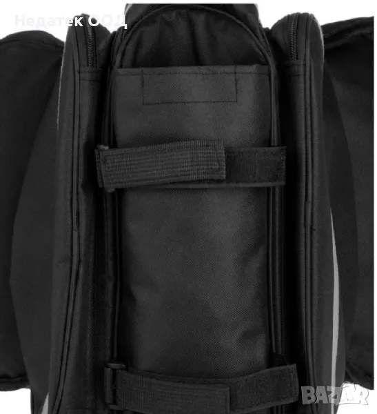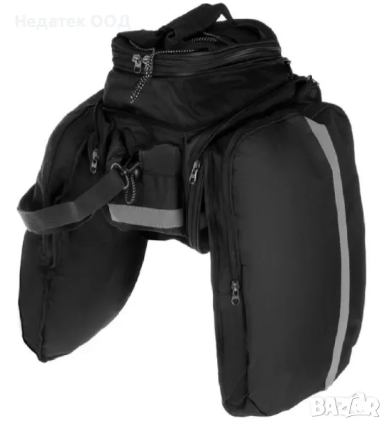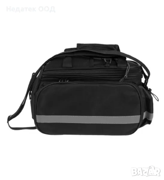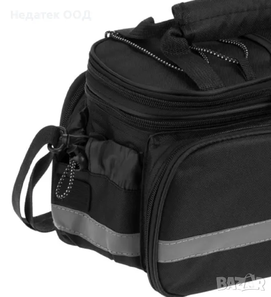 Велосипедна чанта в черен цвят от 600D плат, с големи пространства, 27x5x33cm джобове, които се разгъват отстрани, дръжка, външни джобове и регулируема презрамка. В долната част има водоустойчива качулка за покриване на чантата в случай на лошо време.