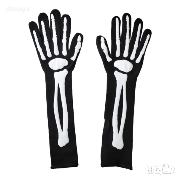 Търсите идеалния аксесоар за Хелоуин или парти с костюми? Нашите дълги ръкавици с кости на скелет са перфектният избор! Изработени от висококачествен еластичен текстил, тези черни ръкавици са с дължина 38 см и осигуряват комфортно прилягане на ръцете. С уникален принт на скелетни кости, те ще добавят завършен и оригинален акцент към всеки костюм.