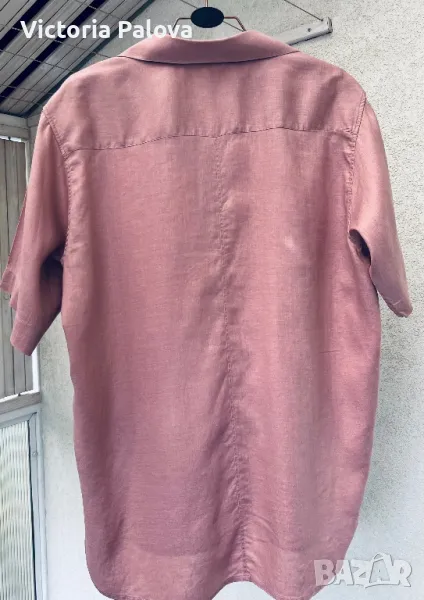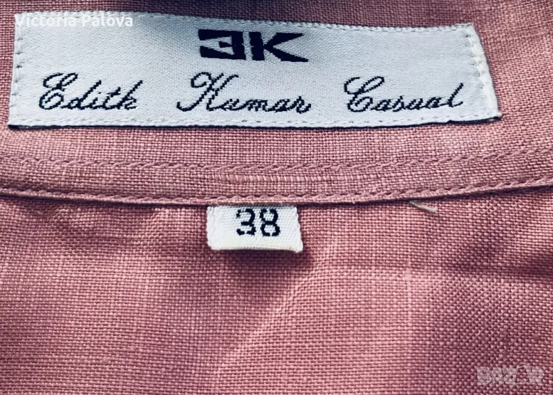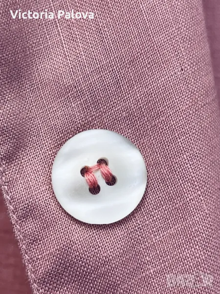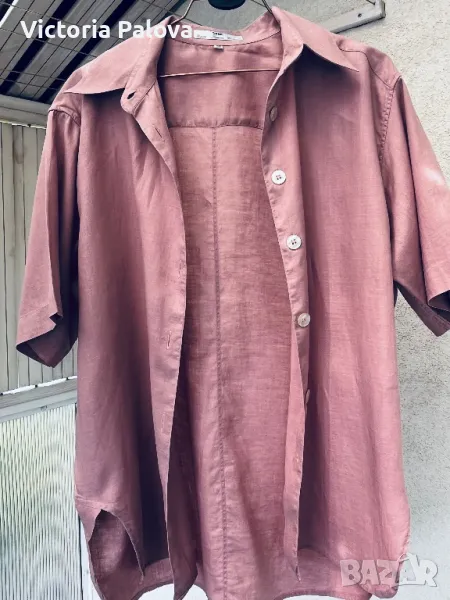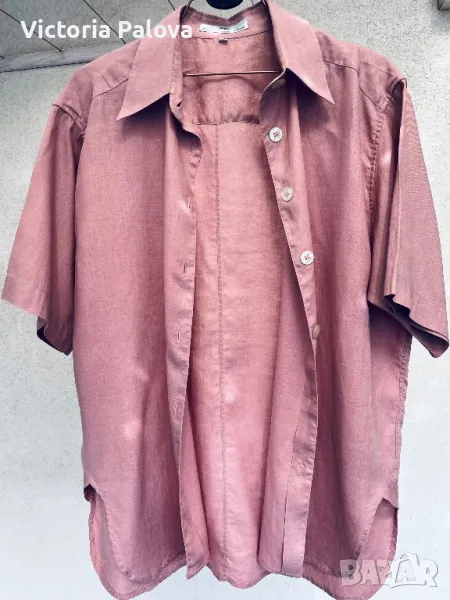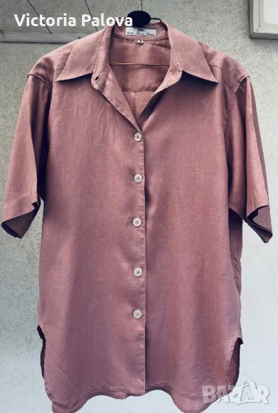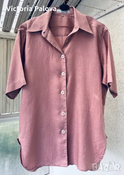 Невероятен лен - много гладък, много тънък ( но плътен), с копринен блясък - изобщо материята прилича на коприна. Цветът е много интересен, пастелен и приглушен. Кройката е права, объл долен край, цепките са особени - те са странични и идват малко отпред, много красиви. Рамо - 50см, ГО - 61см, дължина отпред - 75см, отзад - 79см, ръкав - 28см.