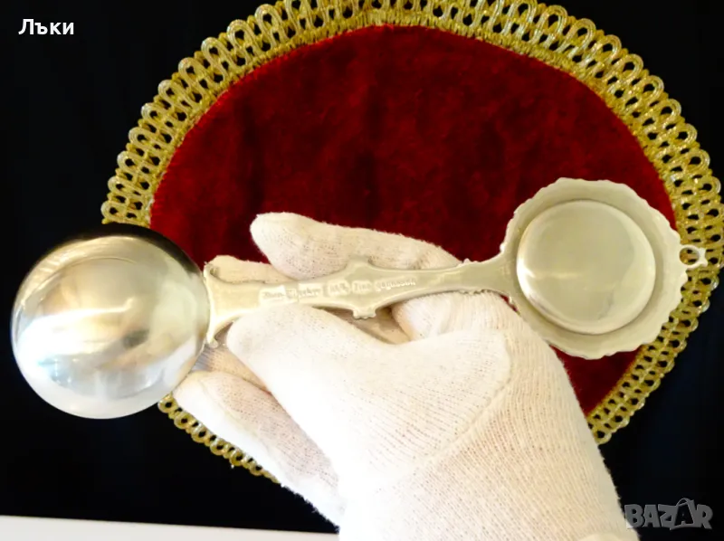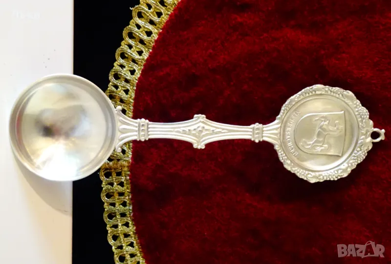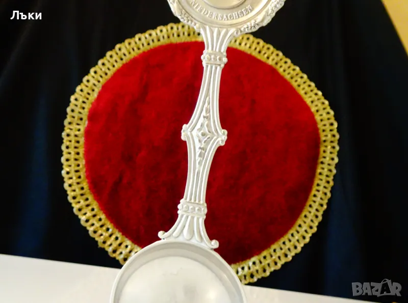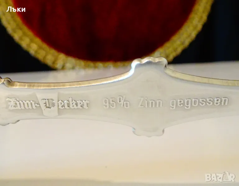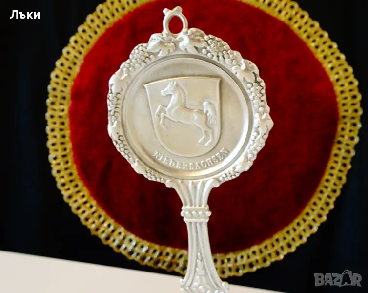 Старинна колекционерска калаена лъжица,майсторска ръчна изработка от 95% калай и 5% сребро,маркирана като патентован модел.Декорирана с изправен кон,герб на Niedersachsen,преплетени лози с грозде и красиви орнаменти.Перфектно състояние,като сребърна.Дължина
