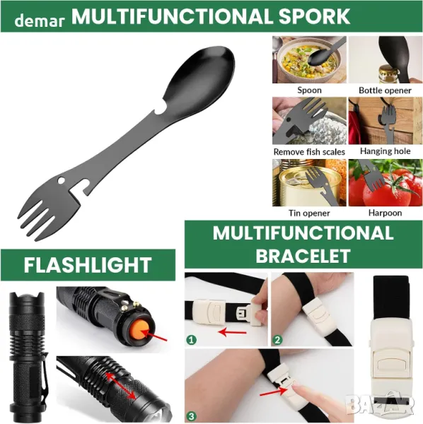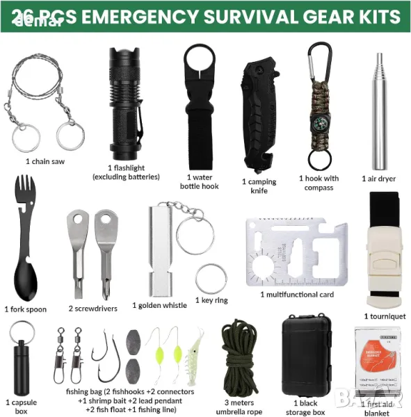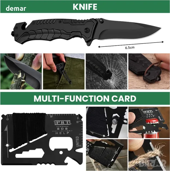 Този професионален комплект за оцеляване при спешни случаи 25 в 1 е компактен, преносим и изработен от издръжливи материали, за да се справи с тежки условия на открито. Той включва универсални инструменти за различни дейности като къмпинг, туризъм и колоездене и се предлага във водоустойчив калъф за лесно съхранение в раницата или колата ви. Проектиран да ви държи подготвени за извънредни ситуации, той е надежден спътник за любителите на открито, гарантирайки, че можете да се справите с всяка неочаквана ситуация. Идеален за лична употреба или като практичен подарък за авантюристи.