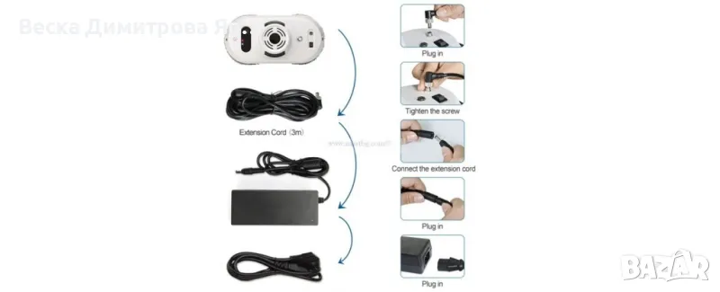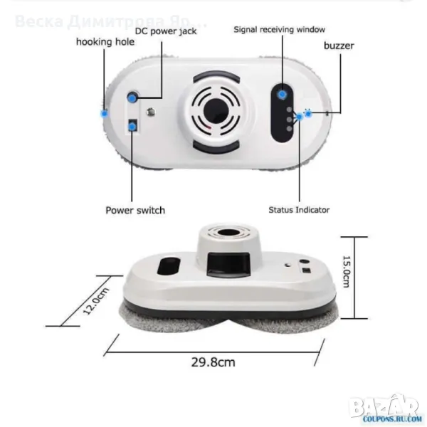 Робот за почистване на прозорци с дистанционно управление/ Материал: ABS пластмаса; Обхват на мощност: 100-240 V, 50-60 Hz; Консумация на енергия: 80 вата; Тип приемане: Вакуумна адсорбция; Скорост на почистване: 4,0 минути на квадратен метър; Функция: За сухо и мокро почистване; Режим на почистване: 3; Област на приложение: Стъкло, прозорец, външна стена, керамична плочка, вертикална маса; Разход: 75 W Дължина на кабела: 4 м;/ Размер на машината: 295 * 148 * 120 мм/Има защита от падане; с инфрачервено дистанционно, жироскоп за планиран път; След като стартирате уреда изчакайте 20 секунди, докато синята светлина престане да мига след това вече може да започнете работа с него. Това изчакване се дължина на факта, че робота си определя равнината.