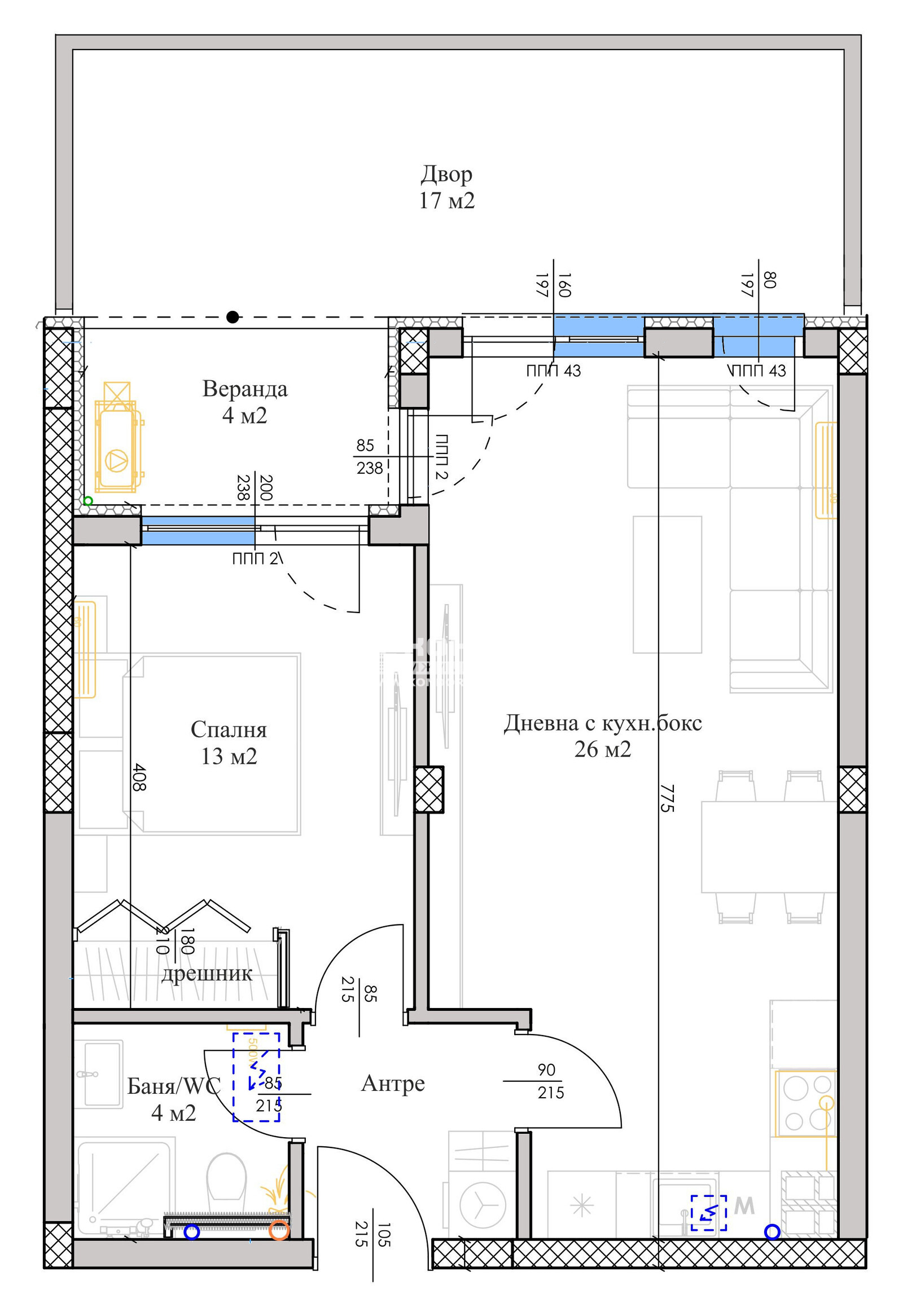 Разпределения - Апартаментът, който Ви предлагаме се състои от светла дневна с кухненски бокс 26 кв.м., спалня с килер 13 кв.м. баня с тоалетна, антре и прекрасен двор 21 кв.м.