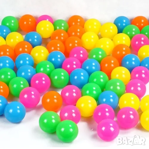Комплект от 100 броя забавни разноцветни леки топки с диаметър 7 см в мрежа за удобно съхранение и пренасяне. Подходящи за детски партита, детски кътове, игра у дома или на двора. Може да се използват в басейни за игра. Диаметър топка - 7 см. Материал - пластмаса. Цвят - различни цветове. Подходящи за деца над 3 години.