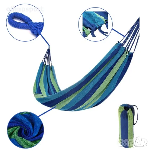 Хамак MAXI, дължина до 260 см, платно 190x80 см, от здраво памучно платно. Удобен индивидуален хамак за релакс или четене, подходящ за градината, терасата или къмпинг. Комплектът съдържа чанта за съхранение и пренасяне. Размери платно - 190х80 см. Дължина с въжетата за опъване - 260 см. Максимално натоварване - 120 кг. Тегло - 760 г.