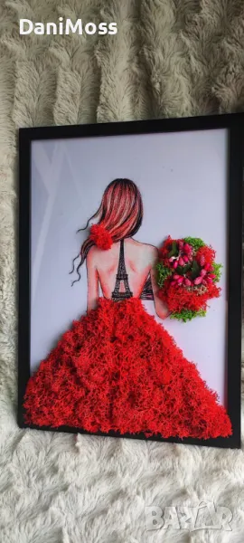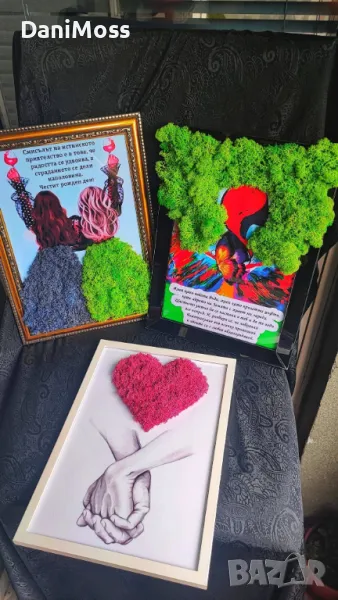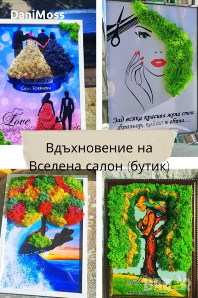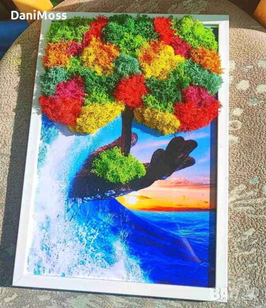 голям размер - 45 х 34 см на 89 лв, а предлагам и най-голям размер от 55 х 45 см на 139 лв и всяка една - идва рамкирана, както я виждате и на снимката - със стойка за поставяне на плота или секцията и със закачалка за пиронче на стената.. Специално стерилизиран: 100% натурален , отблъсква праха и регулира влагата в помещението, като скандинавският мъх не изисква абсолютно никакви грижи, тъй като е хигроскопично растение, което поема влага от стайната , естествена среда и пречиства въздуха, благодарение на своите уникални свойства като това го прави полезен дори за алергични хора