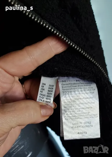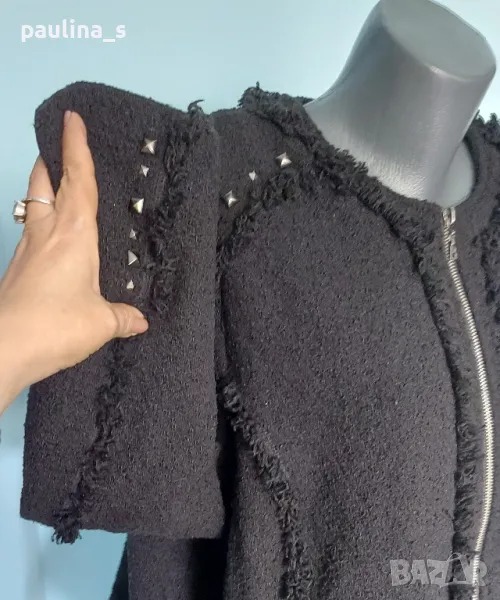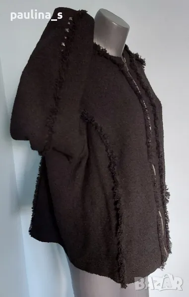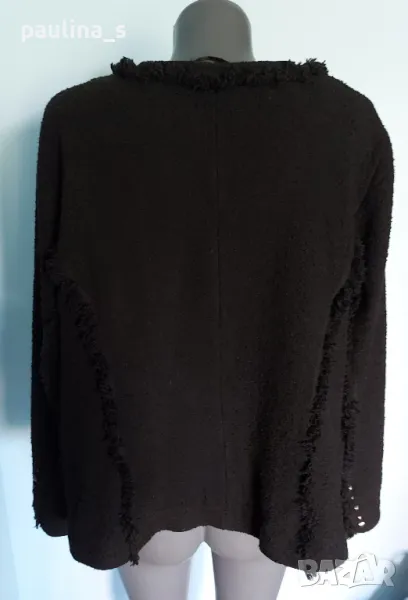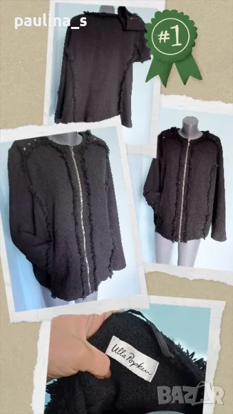 1️⃣. Колаж / 2XL / 3XL "Ulla Popken". Цената е крайна, без пазарлъци 59,99лв / 30 евро. Черно дамско яке тип сако от Букле с декорации - ресни от самия плат, пирамидни кабси, здрав и надежден цип. Не е ново! Платът е плътен, съдържа вълна и вискоза с примеси, стои легнал по тялото. Овърсайз бранд с подобаващо качество, приложен е скрийншот за сверяване на цените. Моделът е с леко втален силует, а ресните придават оптически вталяване и уникалност на дрехата, в стил Коко Шанел сако, но с цип. Без дефекти, не е ново, с актуални снимки, а дрехата приковава погледите!