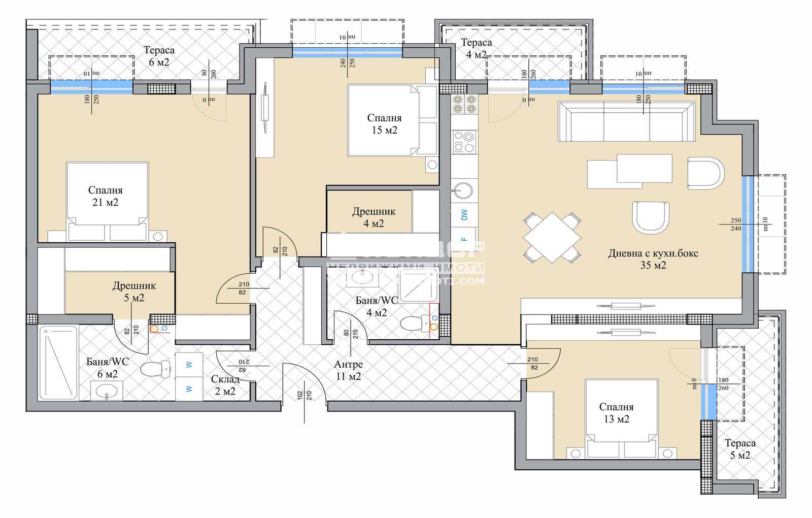 Разпределение: функционален многостаен апартамент, състои се от входно антре с място гардероб, светла югоизточна дневна 35кв.м. оформена на кътове, три големи самостоятелни спални: родителска 21кв.м. със собствена баня и гардеробна, две детски 13 и 15кв.м., едната със дрешник, втора баня с тоалетна, склад/перално помещение и три тераси.