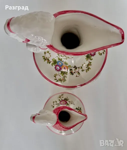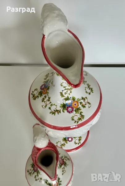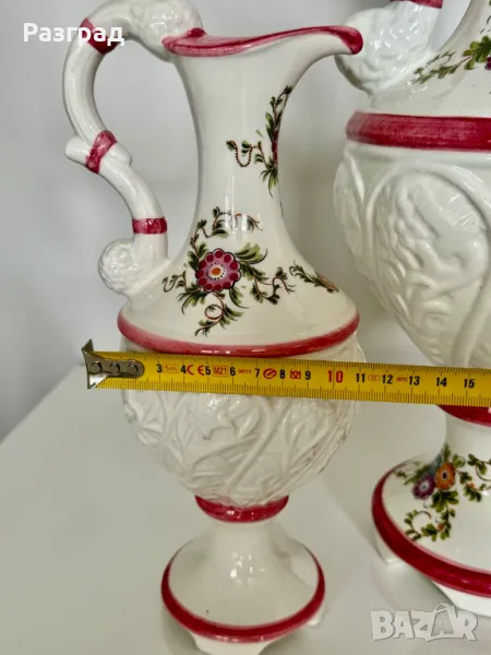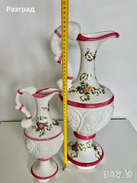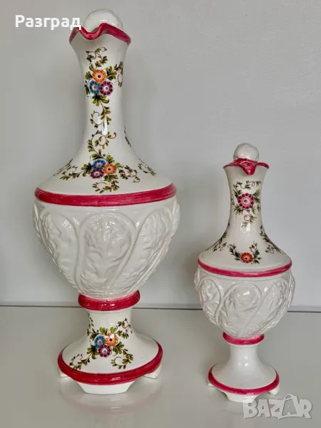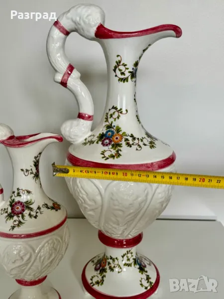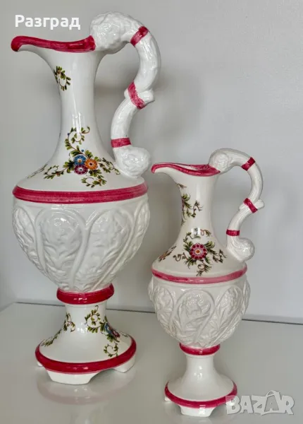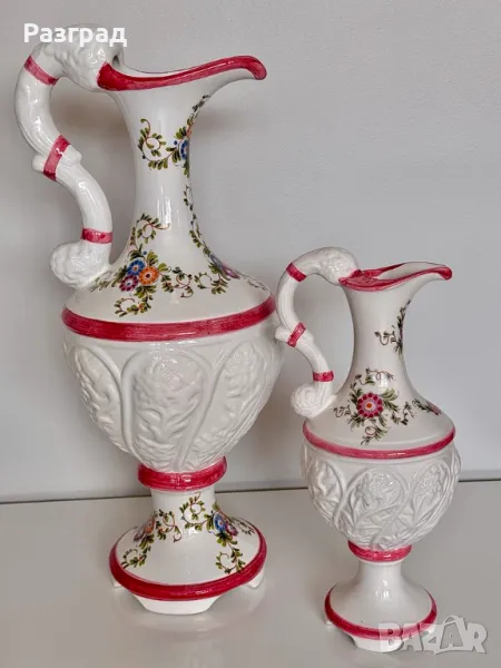 Две произведения на изкуството, произведени в Италия през 50-те години на миналия век в прекрасно запазено състояние. Два броя вази тип амфора с дръжки лебедова шия. Ръчна изработка с внимание към всеки детайл. Декорирани с красиви и ярки цветни композиции и релефни орнаменти. Маркирани -made in Italy. Височина - 47см. и 29см. , ширина в най -широката част -16см и 10см.