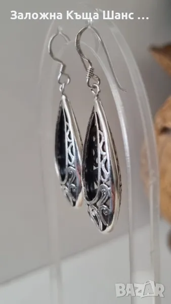 Винтидж сребърни обеци, висяща форма на сълза с изрязана изработка. Тежат 8,88 грама. Дълги са 5,2 см . Състоянието е отлично. Имат налична маркировка .