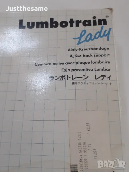 Lumbotrain Lady - Активна поддържаща лента за гърбаОписание:Използвана, но в добро състояние активна поддържаща лента за гърба Lumbotrain Lady. Продуктът е с нормални следи от употреба и е идеален за жени, които търсят ефективно облекчение на болките в долната част на гърба.Кутията не е в добро състояние.Характеристики на продукта:*Марка: Bauerfeind*Модел: Lumbotrain Lady*Размер: 4 или 100-110см в долната част на гърба*Функции: Стабилизира и облекчава болките в долната част на гърба, подобрява стойката и активира мускулите на корема и гърба по време на движение.*Материал: Дишаща, лека и влагопоглъщаща материя, която е нежна към кожата.*Допълнителни функции: Триъгълна подложка за масаж на тригерни точки, лесна за поставяне и сваляне с практични ръкохватки.*Подходяща за: Болки в гърба, навяхвания, леки хернии, мускулна слабост, дегенерация на междупрешленните дискове, след епидурални инжекции и след бременност.За марката Bauerfeind: Bauerfeind е водещ немски производител на медицински продукти с високо качество, които се отличават с иновативен дизайн и ефективност. Продуктите на Bauerfeind са известни със своята надеждност и комфорт, като предоставят оптимална поддръжка и облекчение на болките.