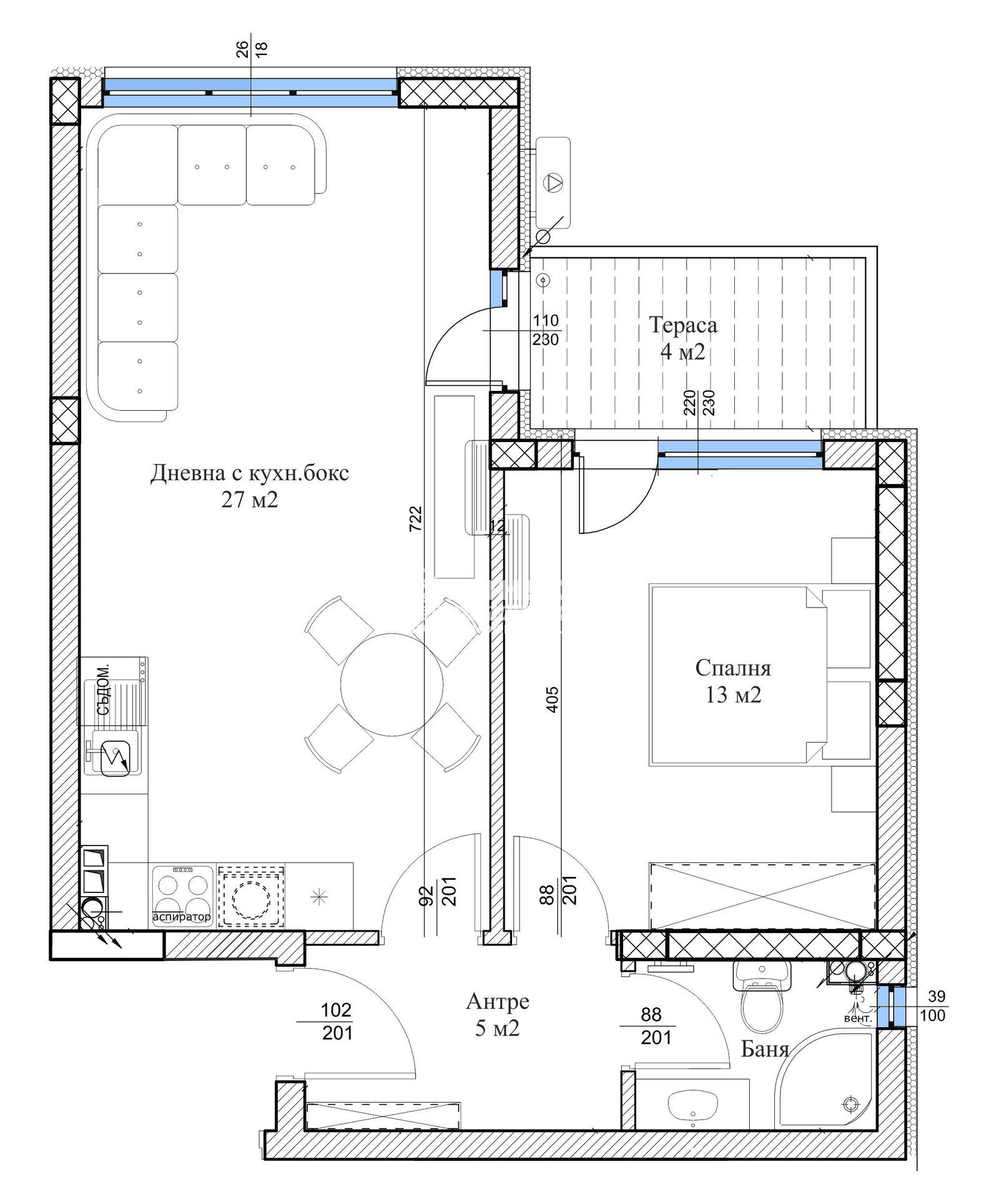 Оферта 65385: Комплексът се състои от две самостоятелни сгради - тип Фамилни къщи, намиращи се в един от най-бързо развиващите се и спокойни райони на града. Сградите са проектирани с изключително Нисък Процент общи части - 12% , което дава повече реална площ и пространство в самите жилища . Заложено е на модерна и раздвижена архитектура, създадени с идеята да осигурят максимален комфорт, лукс и удобства. Апартаментът се състои от просторна и функционална дневна - 26.70 м2, имаща излаз на тераса, самостоятелна комфортна спалня - 13.80 м2, баня с тоалетна и широко входно антре. Към апартамента има избено помещение включено в цената. Жилищата са завършени с висококачествени материали, гарантиращи качество и сигурност. Сградата е изградена с Австрийски червени тухли Винербергер и е издадена в следния вид: шпакловка на стени и тавани, подове- изравнителна замазка, РVС-дограма, масивни блиндирани входни врати, просторно и светло стълбище, хидравличен асансьор, топло и хидро изолация, иноксови