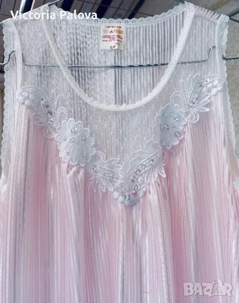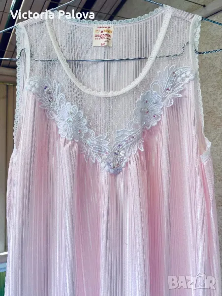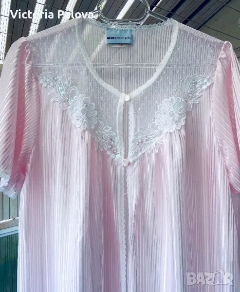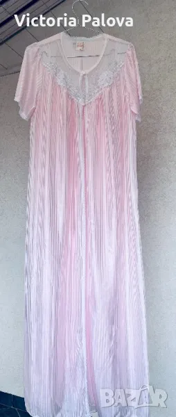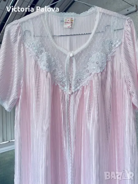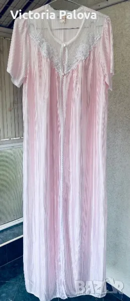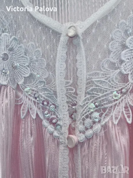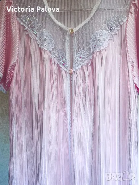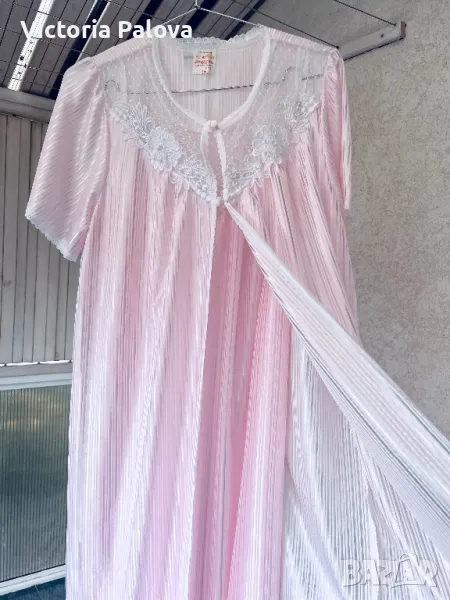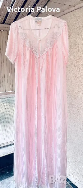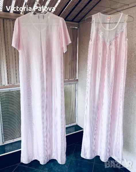 Красив комплект нощница и халат, нежен розов цвят с блясък и камъчета по деколтето. Нощницата е дълга 136см, ГО - 50см. Халатът е дълъг 140см, рамото е 40см.