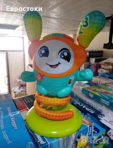 Докато бебето натиска бутоните, интерактивният танцуващ приятел оживява с цветни светлини и над 75 звукови активации, които включват шумове, мелодии, песни и фрази, които запознават вашето мъниче с букви, броене, цветове и много други.