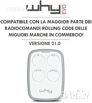 Съвместимост: Дистанционното управление Why Evo Gate Opener е съвместимо с повечето дистанционни управления, както с подвижен код, така и с фиксиран код с честота от 300 до 868 MHz, а контролните кутии получават съвместимост с повече от 56 марки, присъстващи на пазара.
