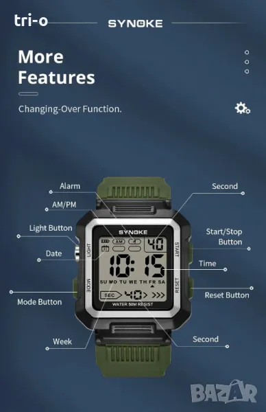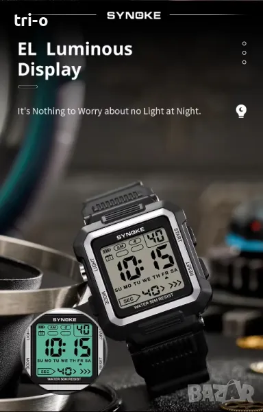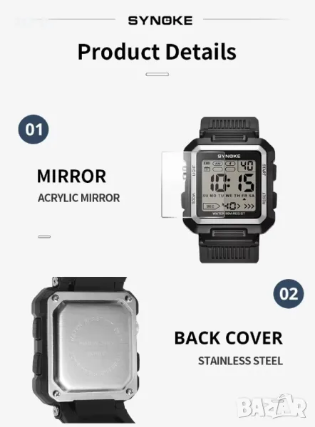 • Дигитален механизъм: Цифровият ръчен часовник SYNOKE разполага с прецизен дигитален механизъм, осигуряващ точно отчитане на времето и дисплея.