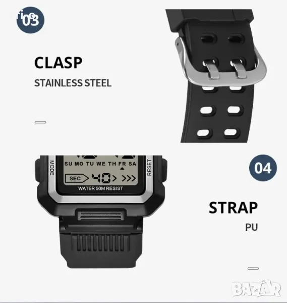 • Спортен дизайн: Проектиран със спортна правоъгълна форма и здрава гумена лента, този часовник излъчва здрав, вдъхновен от военните стил, който е едновременно функционален и модерен.
