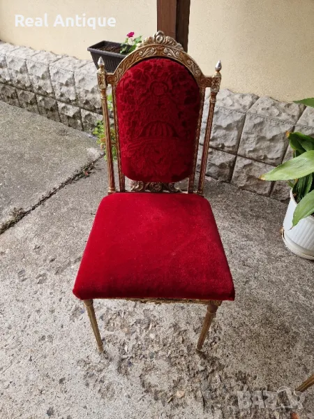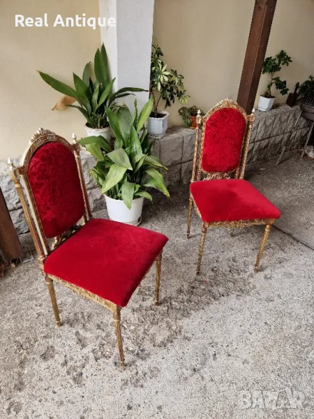 Продавам чифт страхотни антикварни метални столове в много добро състояние. Тежки здрави масивни. Размери височина 98 см ширина 45 см и дълбочина 45 см. Чудесно допълнение към интериора на Вашия дом офис вила ресторант хотел. Работя с всички куриери. Отговарям бързо.
