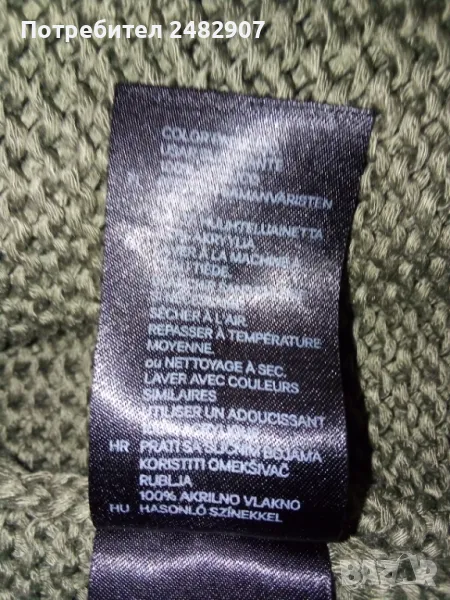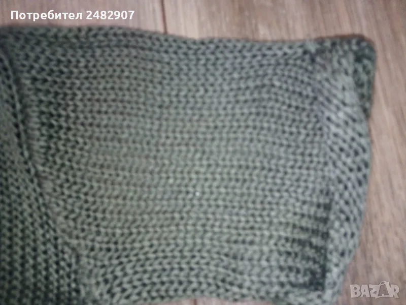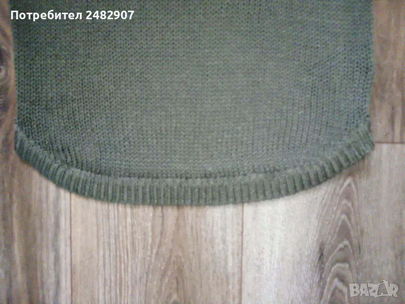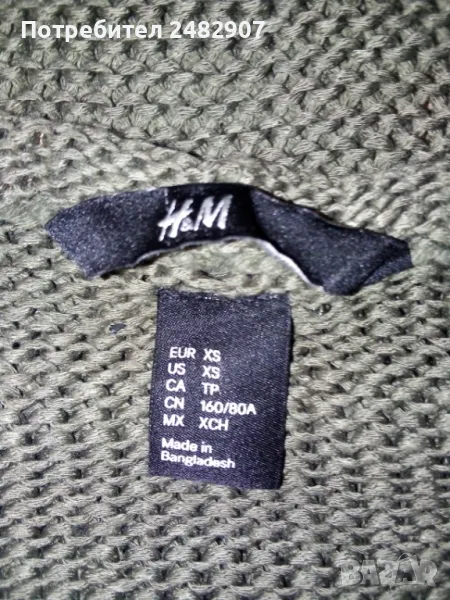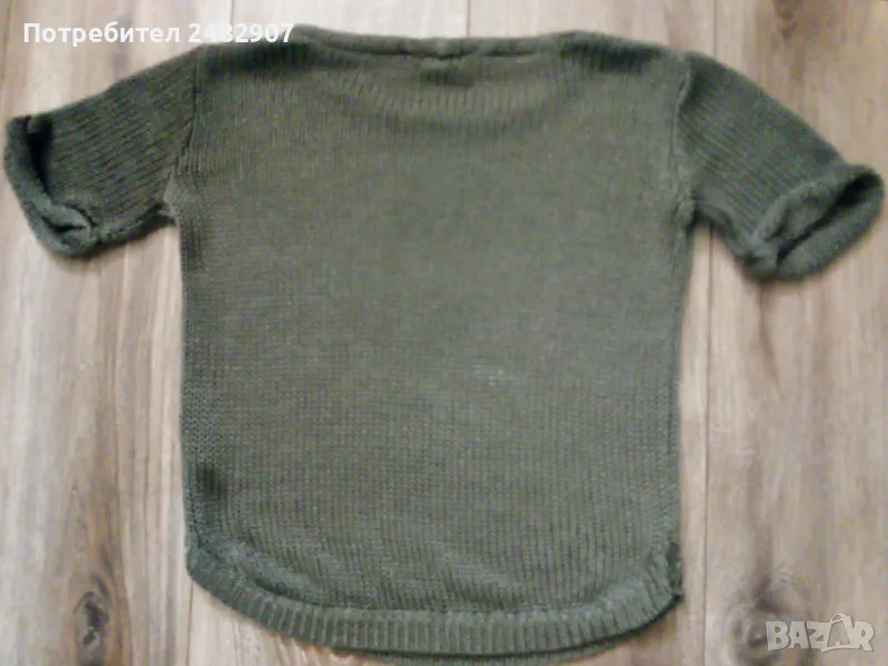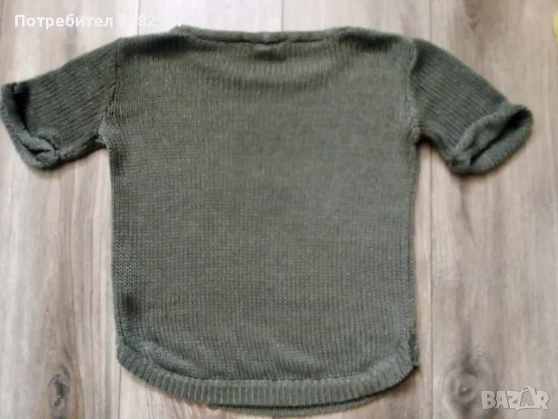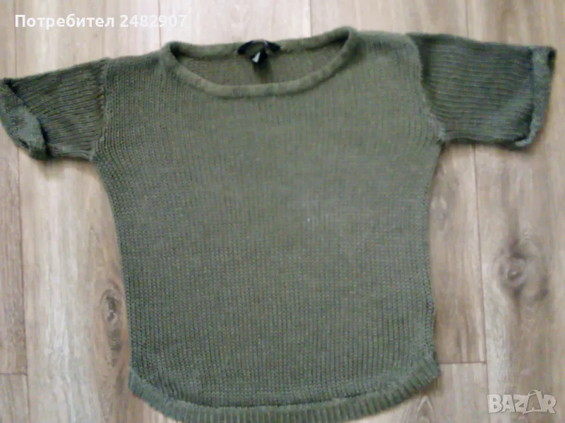 Машинно плетена дамска блуза с къс ръкав в маслено зелен цвят, размер XS. Съдържа 100 % акрил. Ширина в раменете - 39 см, ширина под мишниците - 42 см, ширина в долната част - 38 см, дължина от рамото до долу - 51 см, дължина на ръкава от рамото - 19 см, ширина на ръкава в долната част - 14 см. Много запазена, почти не е използвана, отлично състояние, без забележки.
