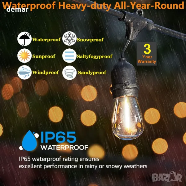 15 метра стрингови лампи + 3M удължителен кабел - няма нужда да купувате допълнителен удължителен кабел, за да спестите парите си и да го използвате за външни светлини. IP65 водоустойчиви външни струнни светлини - тежък кабел, съчетан с нечупливи LED крушки, може да издържи при всяко време, независимо от дъждовни, горещи и мразовити дни, може да се използва навън през цялата година. Енергийно ефективни нечупливи осветителни тела за вътрешен двор - 1W led крушка, равна на 11W лампа с нажежаема жичка, с по-висока яркост. Това ще спести пари с 90% от сметката за електричество. Разнообразни приложения - тези външни осветителни тела с фестон пасват на вашата градинска ограда, осветителни тела за вътрешен двор, покрив на къща, декорация на пергола, осветителни тела за беседка, дървета, заден двор и всички възможни места.
