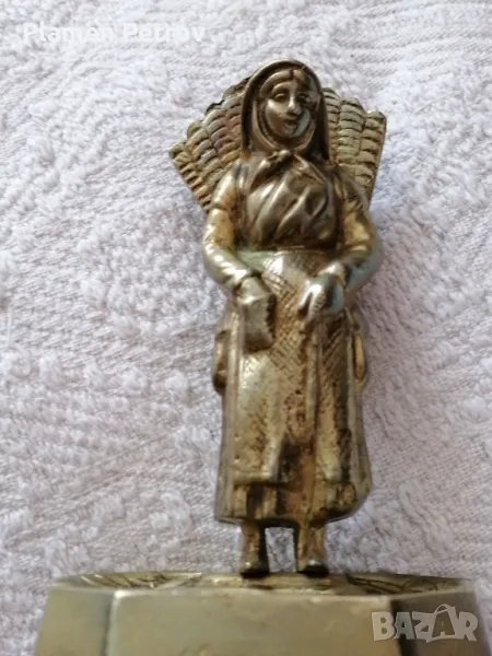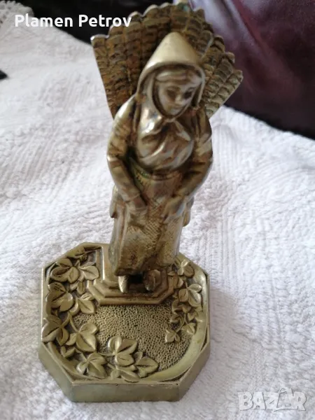 Стара месингова фигура на жена от село събираща продукция в коша на гърба, постамента е с флорални мотиви размерите са 14 см и височина 8 см и ширина на постамента без забележки е Стара Холандия, масивен бронз около 1 кгр ръчно изработена от края на 19