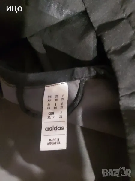Състояние отлично на горнището Adidas. Със качулка и два джоба с ципове. Ластици на кръста и отзад на качулката. Много тънка и приятна на допир материя. Дължина 69см. широчина на подмишниците 49см. Размер XS. Цена 50лв.