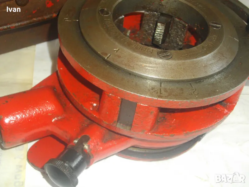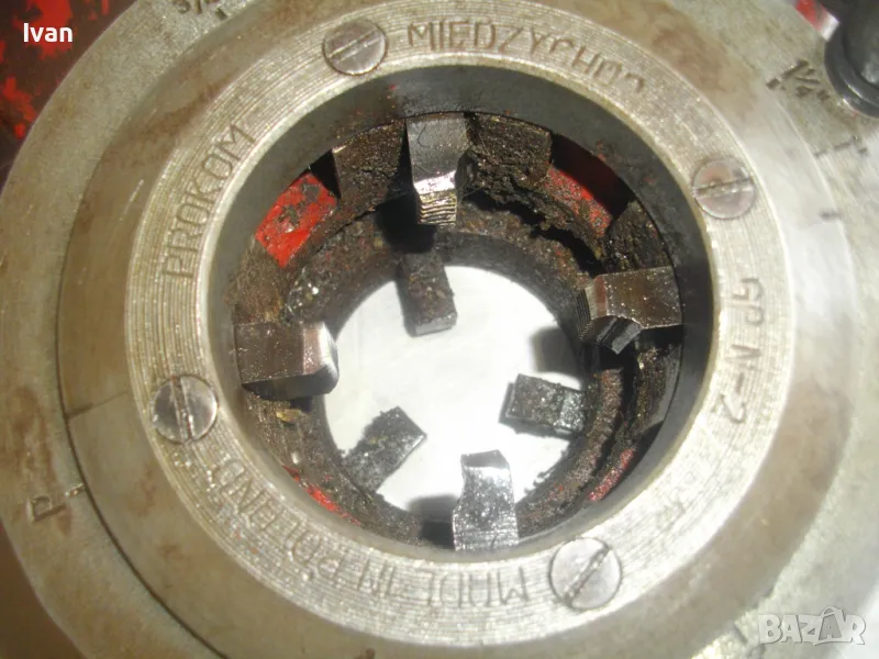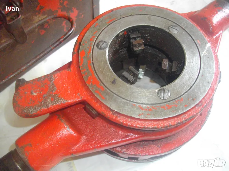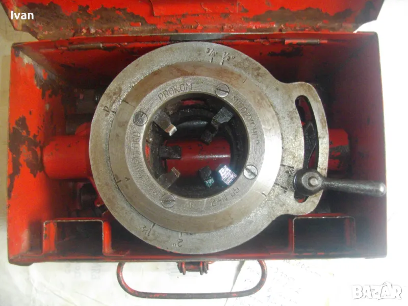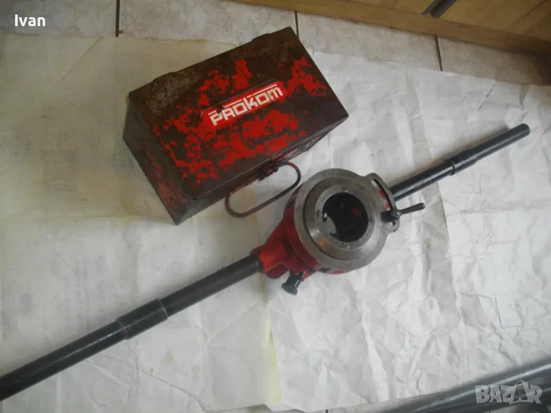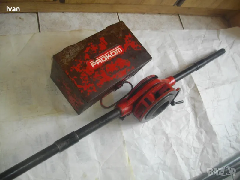 ОПИСАНИЕ на ръчна водопроводна плашка винтонарезка венторез винторезка за направа на разби на метални тръби до 2 цола с поставени ножове размер 1 1/2 - 2 цола - полска старо качество PROKOM в метална кутия - отлично състояние - профилактирана - цена 299 лв. Резбонарезна плашка водопроводна винтонарезка / винторезка/ пафта/ винторез/ винтонарез за направа на външни резби на тръби. Полско производство, марка ПРОКОМ №2. Маркировки PROKOM 2 Made in Poland - MEDZ YH GP № 2. Плашката е с размеер на направа на резбонарезна разба на тръби до 2 цола включително, в зависимост от поставен размер ножове. Почти нова, с много запазен външен вид и отлично техническо/работно състояние. Профилактирана, всички механизми по отваряне и затваряне челюсти и ножове са в пълна техническа изправност. Дръжки - тръби ообщо 4 бр, от дебело масивно желязо ф 25 мм, всяка с дължина от 23 см, за захват от двете страни на плашката, дълги 40 см. Обща дължина на винтонарезката с поставени дръжки тръби - 100 см. Височина на главата - 12 см. Плашката е от старото качество инструменти. Изцяло от дебело масиивно желязо. Задно менгеме за притягане с три челюсти на поставена тръба. Ножове поставени на плашката - 4 бр. размер 1 !/2 - 2 цола. Ножовете са почти нови, отични ,без никакви наранявания по закалената стомана на зъбите. Налична металната оригинална кутия с лога на иинструмента. Размери на кутията - 160 х 260 х 150 мм. Тегло на инструмента с кутията - 10,5 кг. Цена - 299 лв. Твърда цена, без коментар, с поставения размер ножове. При замяна на поставените ножове с друг размер - цена по договаряне, в зависимост от размера ножове.