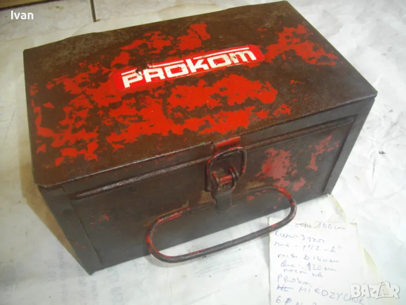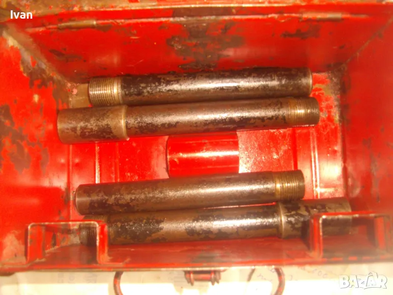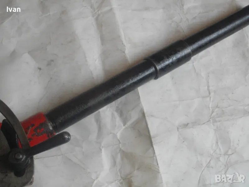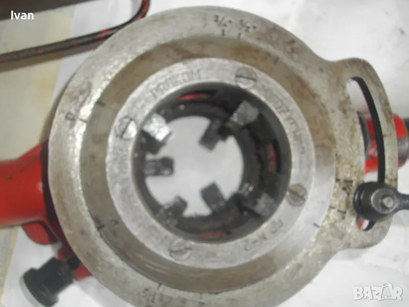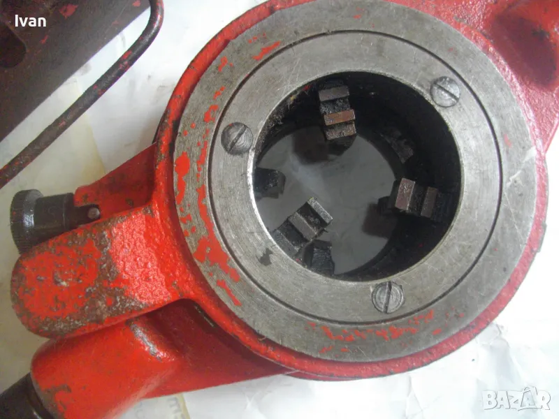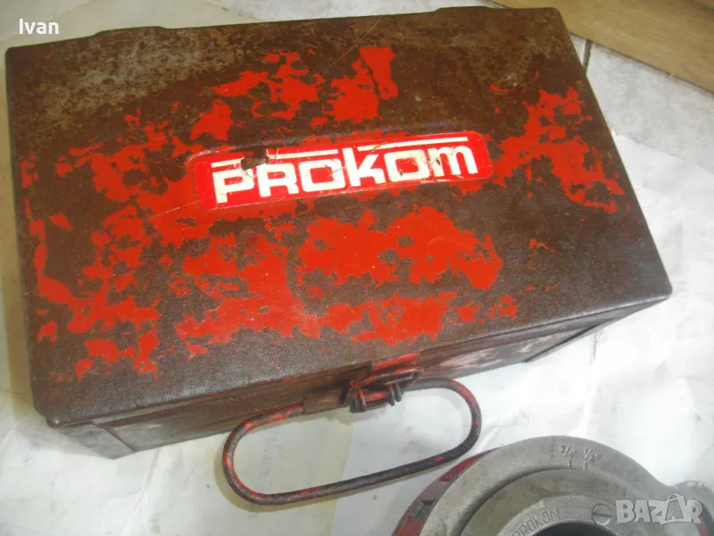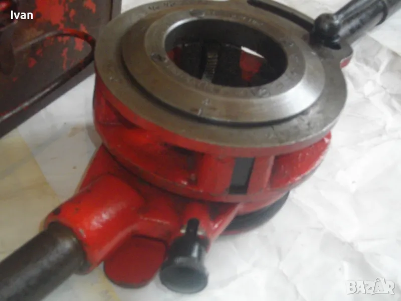 ОПИСАНИЕ на ръчна водопроводна плашка винтонарезка венторез винторезка за направа на разби на метални тръби до 2 цола с поставени ножове размер 1 1/2 - 2 цола - полска старо качество PROKOM в метална кутия - отлично състояние - профилактирана - цена 299 лв. Резбонарезна плашка водопроводна винтонарезка / винторезка/ пафта/ винторез/ винтонарез за направа на външни резби на тръби. Полско производство, марка ПРОКОМ №2. Маркировки PROKOM 2 Made in Poland - MEDZ YH GP № 2. Плашката е с размеер на направа на резбонарезна разба на тръби до 2 цола включително, в зависимост от поставен размер ножове. Почти нова, с много запазен външен вид и отлично техническо/работно състояние. Профилактирана, всички механизми по отваряне и затваряне челюсти и ножове са в пълна техническа изправност. Дръжки - тръби ообщо 4 бр, от дебело масивно желязо ф 25 мм, всяка с дължина от 23 см, за захват от двете страни на плашката, дълги 40 см. Обща дължина на винтонарезката с поставени дръжки тръби - 100 см. Височина на главата - 12 см. Плашката е от старото качество инструменти. Изцяло от дебело масиивно желязо. Задно менгеме за притягане с три челюсти на поставена тръба. Ножове поставени на плашката - 4 бр. размер 1 !/2 - 2 цола. Ножовете са почти нови, отични ,без никакви наранявания по закалената стомана на зъбите. Налична металната оригинална кутия с лога на иинструмента. Размери на кутията - 160 х 260 х 150 мм. Тегло на инструмента с кутията - 10,5 кг. Цена - 299 лв. Твърда цена, без коментар, с поставения размер ножове. При замяна на поставените ножове с друг размер - цена по договаряне, в зависимост от размера ножове.