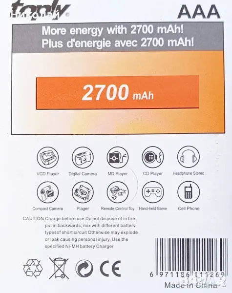 Акумулаторна батерия ААА 2700 mah TOPLY, снимка 1 - Оригинални батерии - 47318477 Акумулаторна батерия ААА 2700 mah TOPLY, снимка 2 - Оригинални батерии - 47318477 1/2