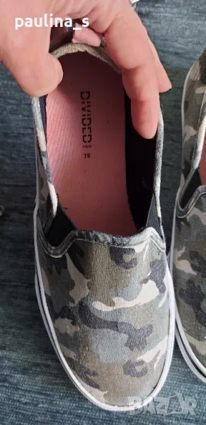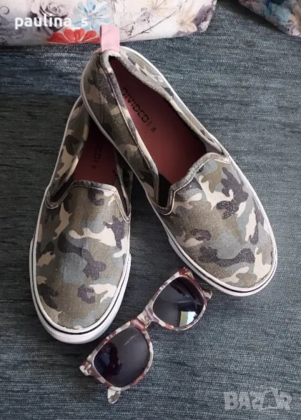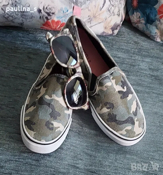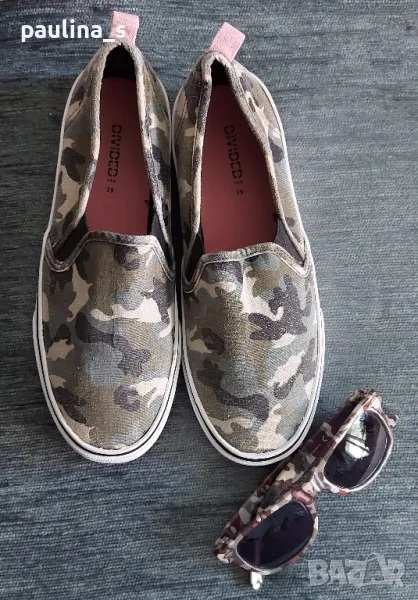 1. "H&M" Аутлет / нови маркови гуменки в камуфлажен принт. Прилагам и скрийншот за сверяване на цените на бранда. Очилата са нови и се продават отделно - цена 14,99лв. Стелка 24,5см.