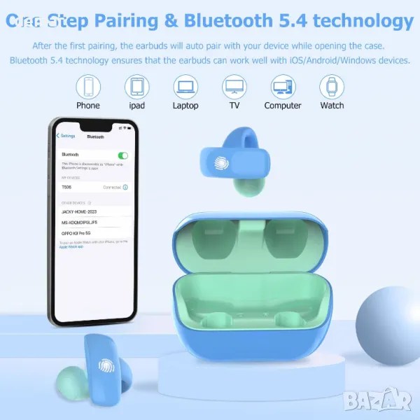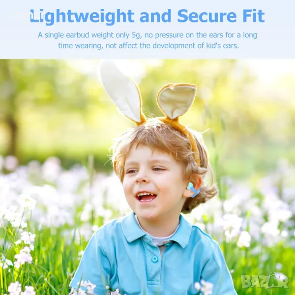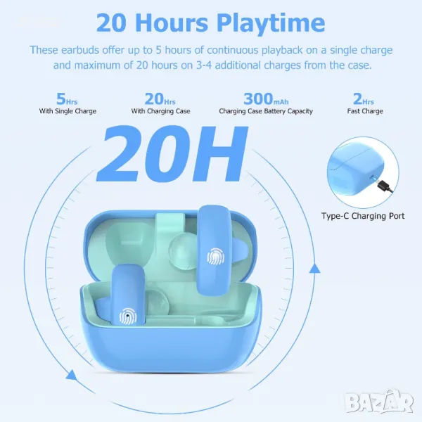 Тези детски Bluetooth слушалки се отличават с отворен дизайн за безопасност, позволяващ външен звук, докато слушате музика, провеждате разговори или тренирате. Дизайнът на щипка за уши осигурява комфорт, хигиена и защита на ушите на децата. Изработени от лек силикон, те са идеални за спорт, тежат само 5 грама и са съвместими с очила или шапки. Оборудвани с Bluetooth 5.4, те предлагат безпроблемна връзка с различни устройства и до 20 часа игра с преносимия калъф за зареждане. Технологията за потискане на шума и ограничението на силата на звука от 85 dB гарантират ясни разговори и безопасно слушане. Лесното сдвояване в една стъпка и сензорното управление подобряват удобството.