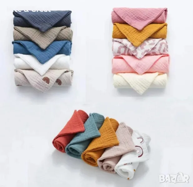 НОВО!🤩 НОВО!🤩 НОВО!🤩Бебешки хавлии от муселин.Наситени цветове.Издръжливи и меки.5бр 14.90лв