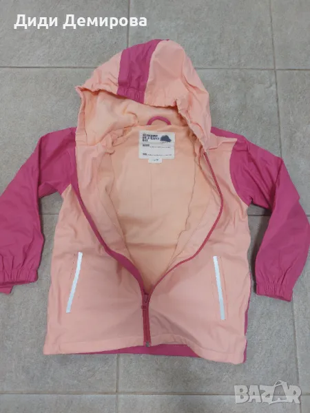 Якето има избледнява драскотина от химикал около 1-1.5 см. Има лека поларена подплата. По етикет е размер 110-116