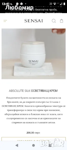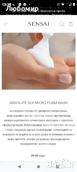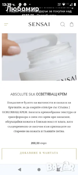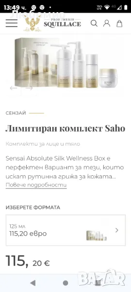 Sensai Absolute Silk Wellness Box е изключителна колекция, съставена от продукти за двойно почистване и двойна хидратация, за да ви предложи момент на благополучие и да насърчи сияйна и сияйна кожа. Absolute Silk - Почистващо мляко: Това почистващо мляко с копринена текстура деликатно премахва грима и мастноразтворимите замърсявания, оставяйки кожата свежа и еластична. Емулгиращата формула съдържа растителни масла, равномерно разпределени в мрежа от сгъстители на основата на нишесте, които предлагат омекотяващи свойства. Нанесено с ръце или с памучен тампон, това почистващо мляко се разтапя в кожата, осигурява копринена мекота и деликатно отстранява замърсяванията и грима. Кремообразната текстура, обогатена със сквалан, масло от семена на жожоба и зехтин, хидратира кожата, оставяйки я копринено мека и обвита в приятен комфорт. Воал от хидратация обгръща кожата, правейки я копринена, еластична и сияйна като след грижа за кожата. Absolute Silk - Micro Mousse Wash: Този пречистващ мус на основата на въглеродна киселина предлага ефервесцентен ефект, който премахва замърсяванията в дълбочина. Кожата изглежда сияйна, чиста и с по-малко видими пори, готова за следващи процедури. Кремообразният и сияен мус съдържа въглеродна киселина, която пречиства кожата, премахвайки себума, замърсяванията и мъртвите клетки. Микромехурчетата, заобиколени от защитна мрежа от полимери и хидратиращи агенти, поддържат еластичността и ефервесценцията по време на нанасяне, предлагайки усещане за благополучие на кожата. След изплакване кожата изглежда стегната, еластична и обвита в деликатен воал от хидратация, предлагащ приятно усещане за комфорт. Порите са почистени от замърсявания и кожата възвръща блясъка си. Свежа, сияйна и комфортна, кожата ви е готова да приеме следващите процедури в рутинната ви грижа за кожата. Absolute Silk - Micro Mousse Treatment: Този лосион против стареене, обогатен с микромехурчета въглена киселина, прониква дълбоко в кожата, за да противодейства на признаците на стареене. Лекият мус с ефервесцентни микромехурчета подобрява състоянието на кожата, в синергия с изключителната патентована формула Koishimaru Silk Royal, пренасяйки ви в ерата на красотата на кожата. При нанасяне микромехурчетата, по-малки от порите на кожата, създават ефервесцентен ефект върху кожата, съживяват я и й придават по-млад, по-тонизиран вид. Кожата изглежда невероятно гладка и сияйна. Той е готов да приеме ползите от последващите процедури във вашата рутинна грижа за кожата. Absolute Silk - Осветяващ крем: Този свеж, но богат крем намалява бръчките и несъвършенствата, като предлага дълбока хидратация. Кожата ще бъде гладка, равномерна и сияйна. Кремът съчетава предимствата на процедурите против бръчки и озаряващи процедури, придавайки нов блясък на кожата отвътре.Тази кутия съдържа: Sensai Absolute Silk Cleansing Milk 30 ml; Sensai Absolute Silk Micro Mousse Wash 50 ml; Sensai Absolute Silk Micro Mousse Treatment 30 ml; Sensai Absolute Silk Illuminative Cream 15 мл.