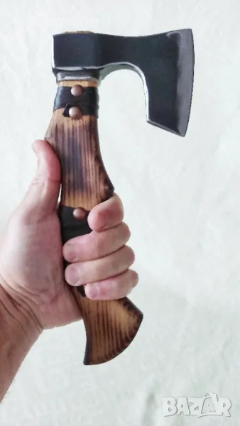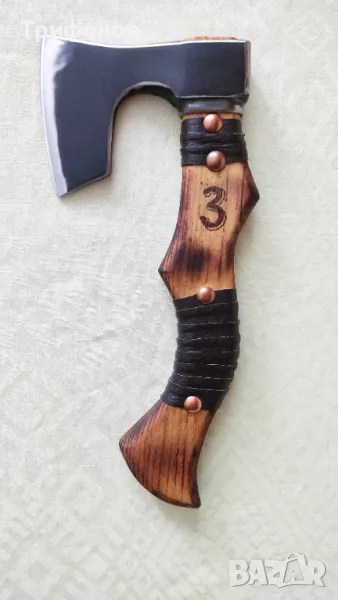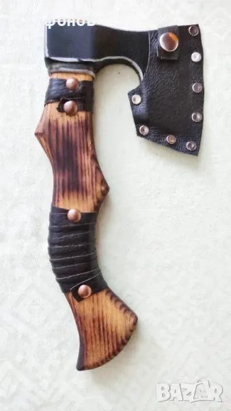 - дръжка - 28 см /пирографирана, опушена, обработена с ленено масло, украсена с естествена кожа, ергономична/