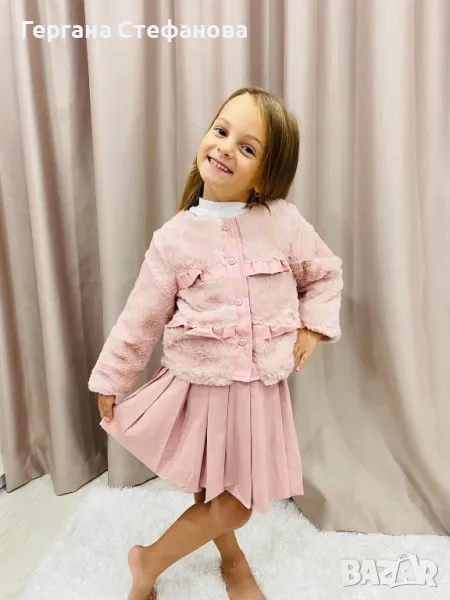 Сет 3 части Кожена пола,блуза и меко пухено палтенце🥰 Размери-3/4г.4/5г.5/6г.6/7г.7/8г. Цена -68лв → Обява 47321921