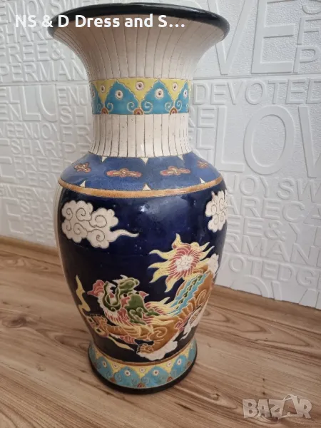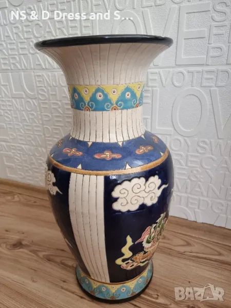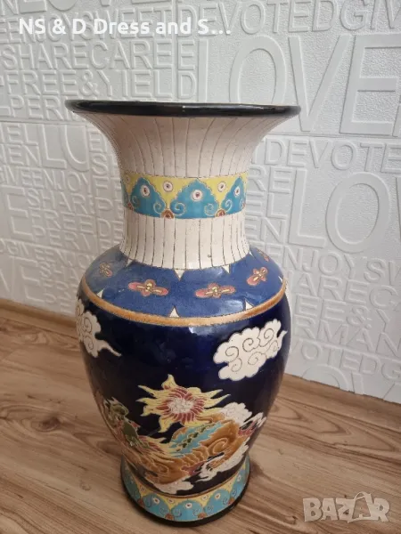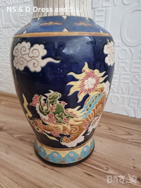 Амфорна порцеланова голяма ваза,колекционерска, релефни орнаменти, пъстри и ярки цветове, ръчно рисувани.
